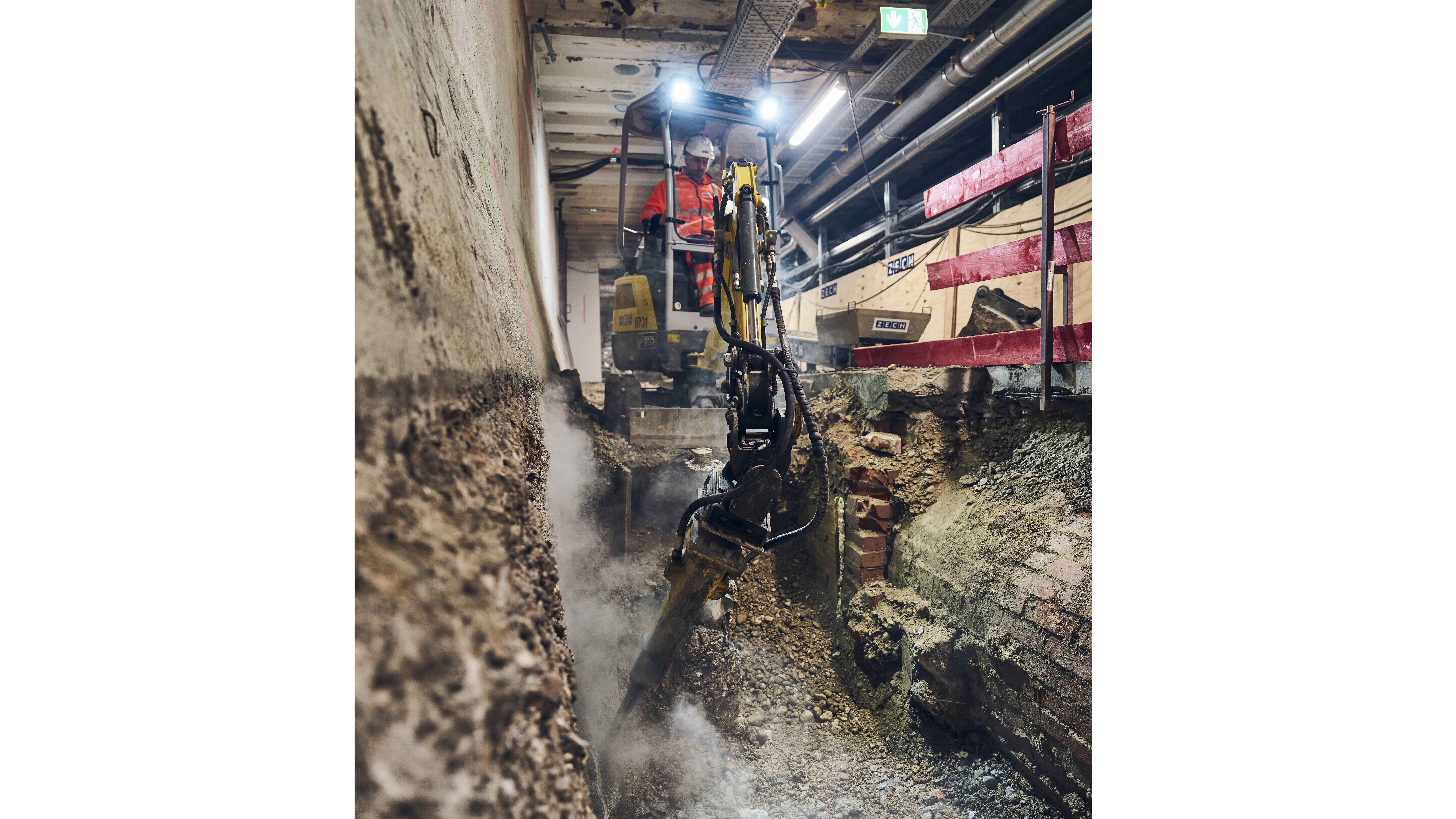 L'attuale tratto edile ha incluso la costruzione di un ponte di montaggio sulle piattaforme passeggeri. Per fornire sostegno, l'impresa edile ZECH Bau SE ha eretto una trave di copertura su pali nel seminterrato. Christian Eineichner, vicedirettore dei lavori di ZECH Bau SE, spiega: "Dato che ci troviamo nel seminterrato, dobbiamo lavorare in modo pulito ed efficiente. Inoltre, ne abbiamo poco spazio a disposizione. Le apparecchiature e le macchine elettriche di Wacker Neuson offrono aiuto prezioso in questo senso. Le attrezzature edili si avviano con la semplice pressione di un pulsante, che aiuta molto. L'intero lavoro viene svolto in modo silenzioso e privo di emissioni dirette, tutti elementi che ovviamente facilitano i nostri dipendenti".